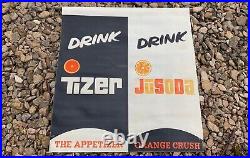 Genuine Double Sided Vintage 1970s Tizer and Jusoda Drinks shop double sided advertising banner. Still has slight ripples in the vinyl where it has been left rolled up for many decades. Probably hung outside the shop to attract customers inside as its double sided. Made from thick vinyl with a nice sheen to it. Has its original wooden hanging bar but sadly string is missing. In very good condition, with some slight fading to one side. Good large size measuring 40cm long x 36.5cm wide. Would look great in any cafe, kitchen or shop display.